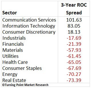 In case you were wondering which groups have lagged the S&P 500 by 50% or more over the last three years, it was commodity-oriented sectors such as energy and materials, along with defensive groups including utilities, health care, consumer staples, and real estate.