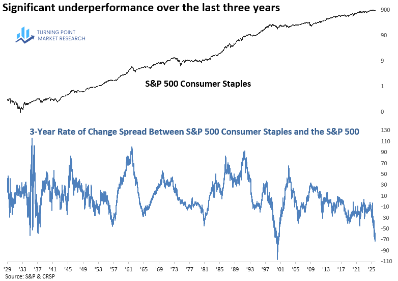 Each week, we examine the stock market’s big-picture trends using rolling and net rolling returns across sectors and sub-industries to identify potential outlier behavior. One development that stood out was the three-year rate-of-change spread between consumer staples and the S&P 500, which fell to a new cycle low on Monday—the weakest reading since June 2000. Real estate exhibited a similar breakdown, declining to a new cycle low and reaching its lowest level since May 2000.