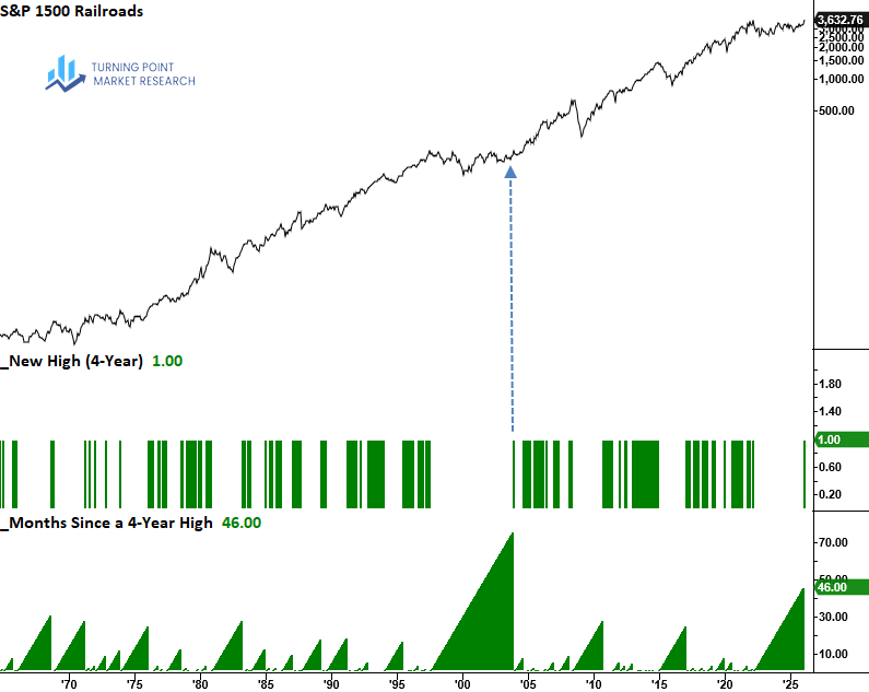 A long-term chart (monthly data) shows the railroad sub-industry is currently experiencing the second-longest consolidation on record. Notably, its prior breakout from an extended base in 2003 marked the start of a value-led equity cycle.