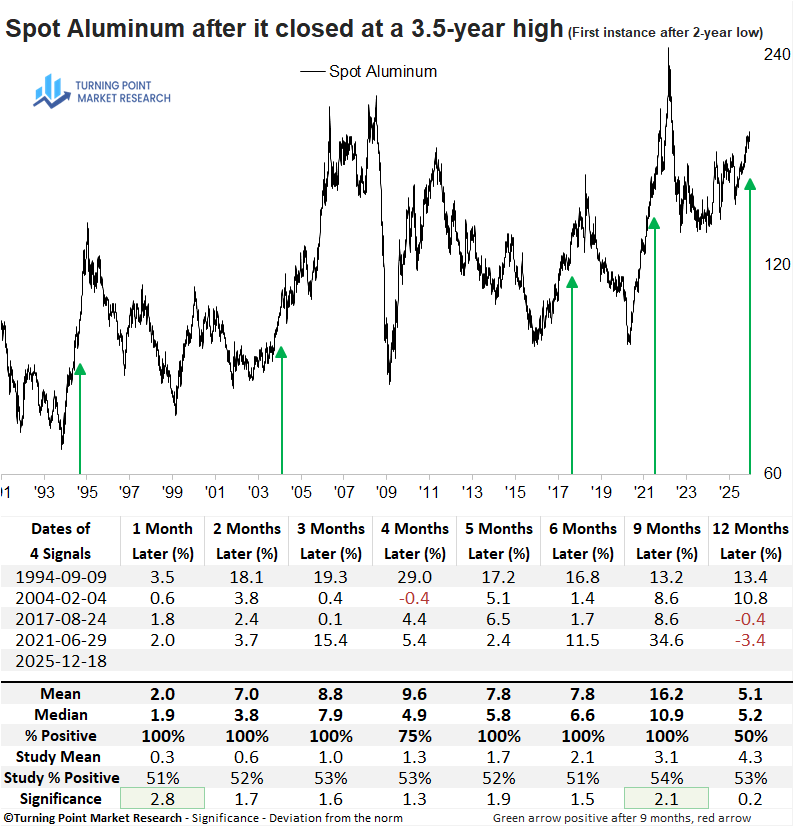 Although the sample size is small, whenever aluminum closed at a 3.5-year high for the first time after a 2-year low, the industrial metal rallied over the subsequent 9 months without exception.