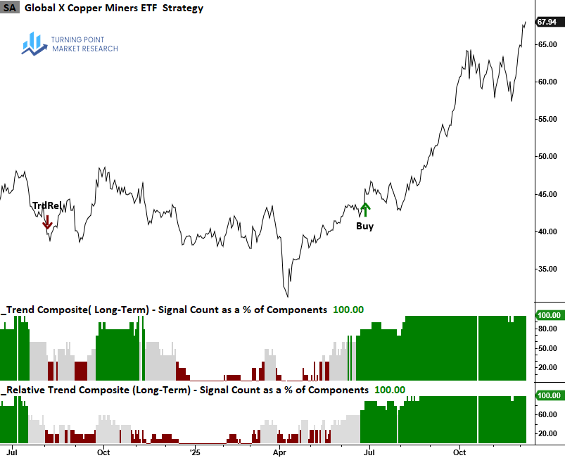 Our dual-trend system flagged the Copper Miners ETF (COPX) in June. Since then, it has outperformed the S&P 500 by 36%. With both the trend and relative-trend composites at a max-bullish 100% and copper’s breakout suggesting further upside, COPX has the potential to be a market leader again in 2026.