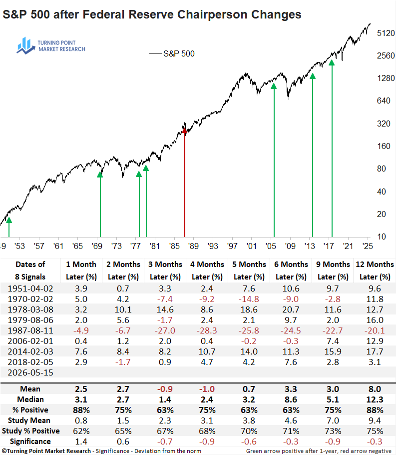 Whether the dip in stocks and metals was a reaction to the announcement is anyone’s guess. Conventional wisdom argues that leadership changes increase market uncertainty, yet the historical record doesn’t support that view. Incoming Fed chairs generally maintain continuity, allowing prevailing conditions to carry forward.