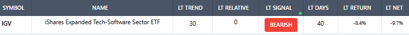 Our dual trend system, which integrates relative strength analysis, generated a sell signal on the iShares Expanded Tech Software ETF nearly two months ago; since that signal, the ETF has declined 8.4% and underperformed the S&P 500 by 9.7%.