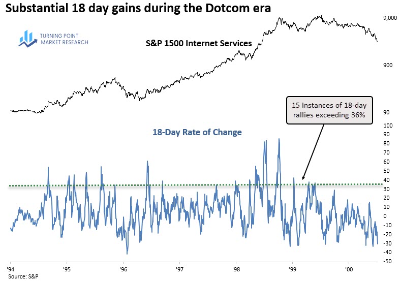 For perspective, we thought it would be useful to share a chart of the dominant group during the Dotcom era—Internet services. During its peak run in the 1990s, it recorded 15 instances in which its 18-day rate of change exceeded 36%, a level comparable to semiconductors today. On two occasions, the rate of change surpassed 80%, underscoring just how extreme that period became. While we do not expect semiconductors to replicate this type of price action given differences in market capitalization and share float, the chart serves as a reminder that when herd behavior converges on a trend, price dynamics can become extreme.