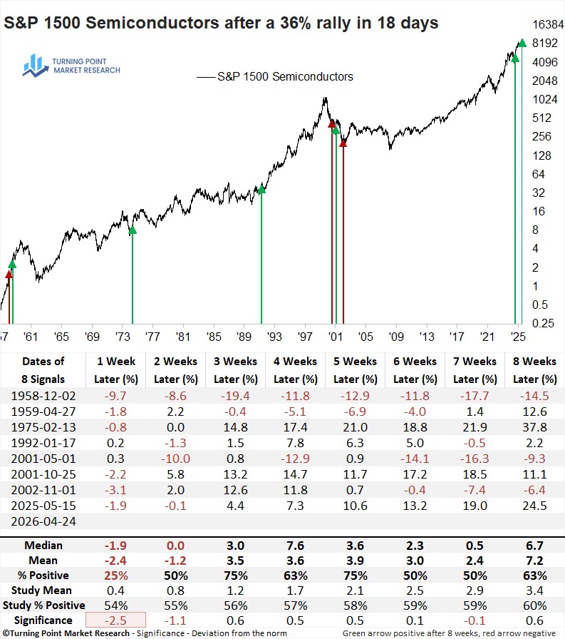 Technology is back—and in emphatic fashion. Following a six-month lull, the sector has surged to new highs, powered by one of the most explosive semiconductor rallies on record. Since March 30th, the S&P 1500 Semiconductor group has jumped 36% in 18 sessions, a feat matched just eight times in over six decades. The semiconductor ETF (SOXX), which utilizes a different component weighting, has done even better, soaring 49%—a move exceeded only once, in November 2002.
