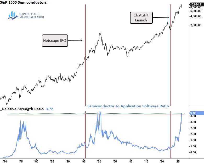 We’ve featured this chart in prior Chart of the Week editions, but it warrants another look as the semiconductor-to-application software ratio has surged to 3.72—now approaching the record high of 3.9 set during the final phase of the Dotcom advance.