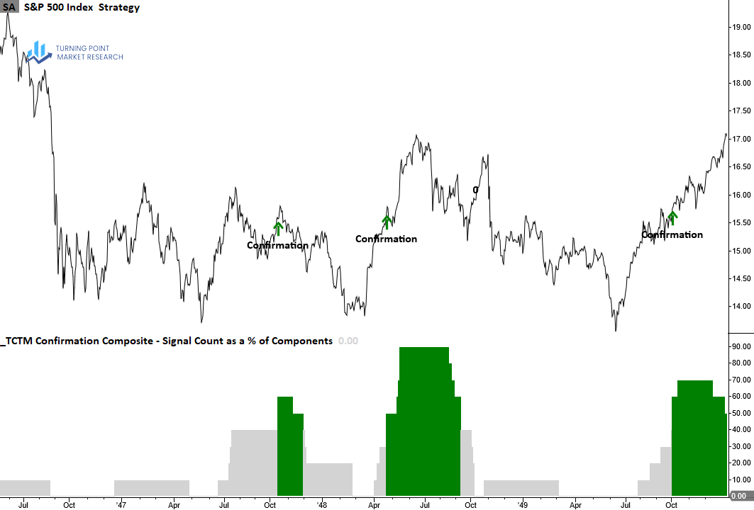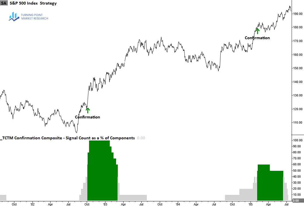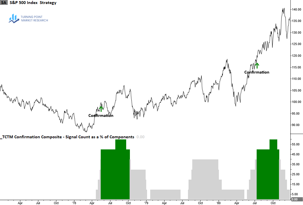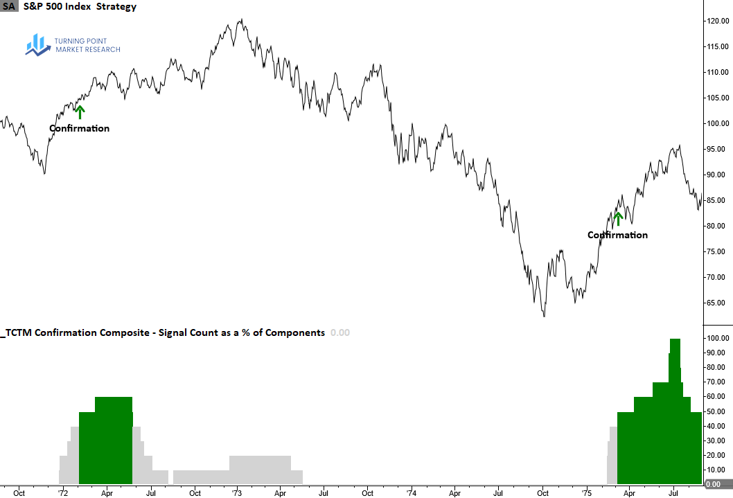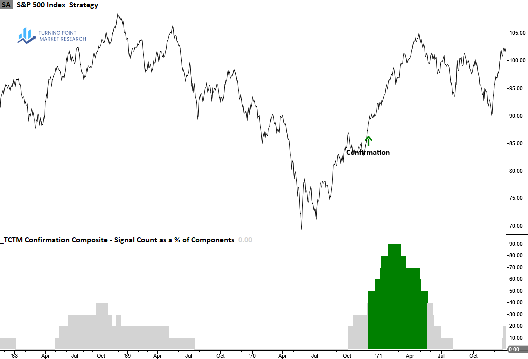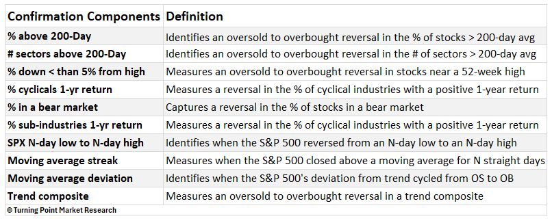The Confirmation Composite confirms the durability of a recovery by verifying that long-term measures of market breadth, index price trends and momentum have shifted from bearish to bullish conditions, suggesting the new uptrend will persist.