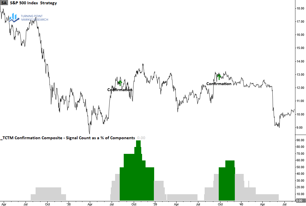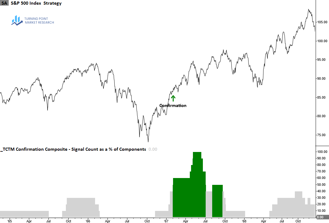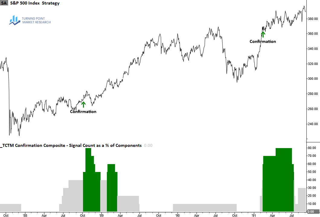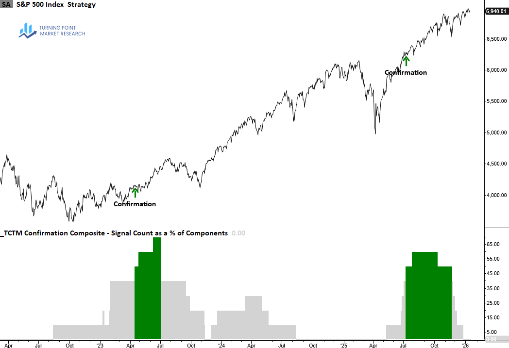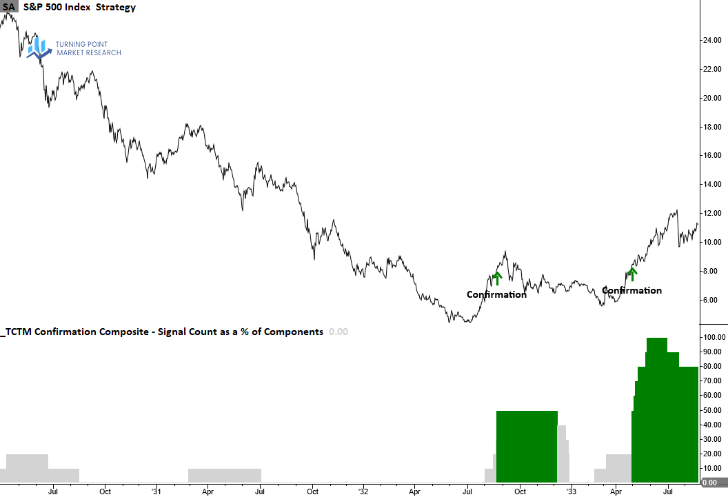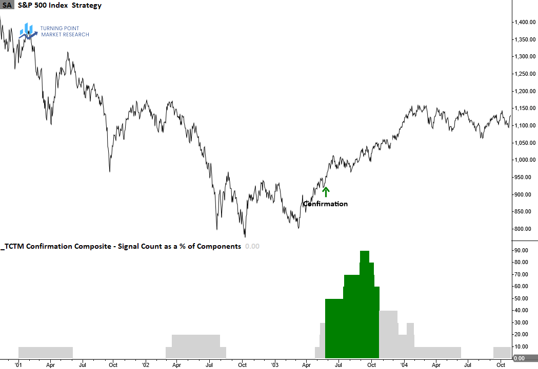 The Confirmation Composite confirms the durability of a recovery by verifying that long-term measures of market breadth, index price trends and momentum have shifted from bearish to bullish conditions, suggesting the new uptrend will persist.