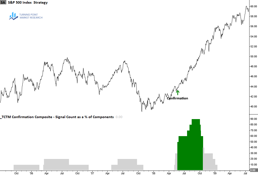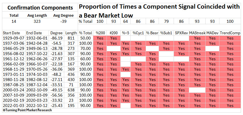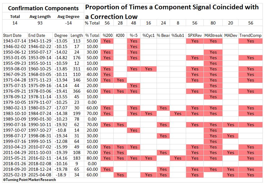 The TCTM Confirmation Composite components have demonstrated a strong, and consistent ability to identify the transition from bearish to bullish market regimes following major bear market lows in the S&P 500. Across historical episodes, an average of 87% of the composite’s members triggered confirmation alerts as the market shifted out of deeply oversold conditions and into sustained uptrends. Notably, in five separate instances, 100% of the components simultaneously signaled, underscoring the breadth and durability of these regime changes.