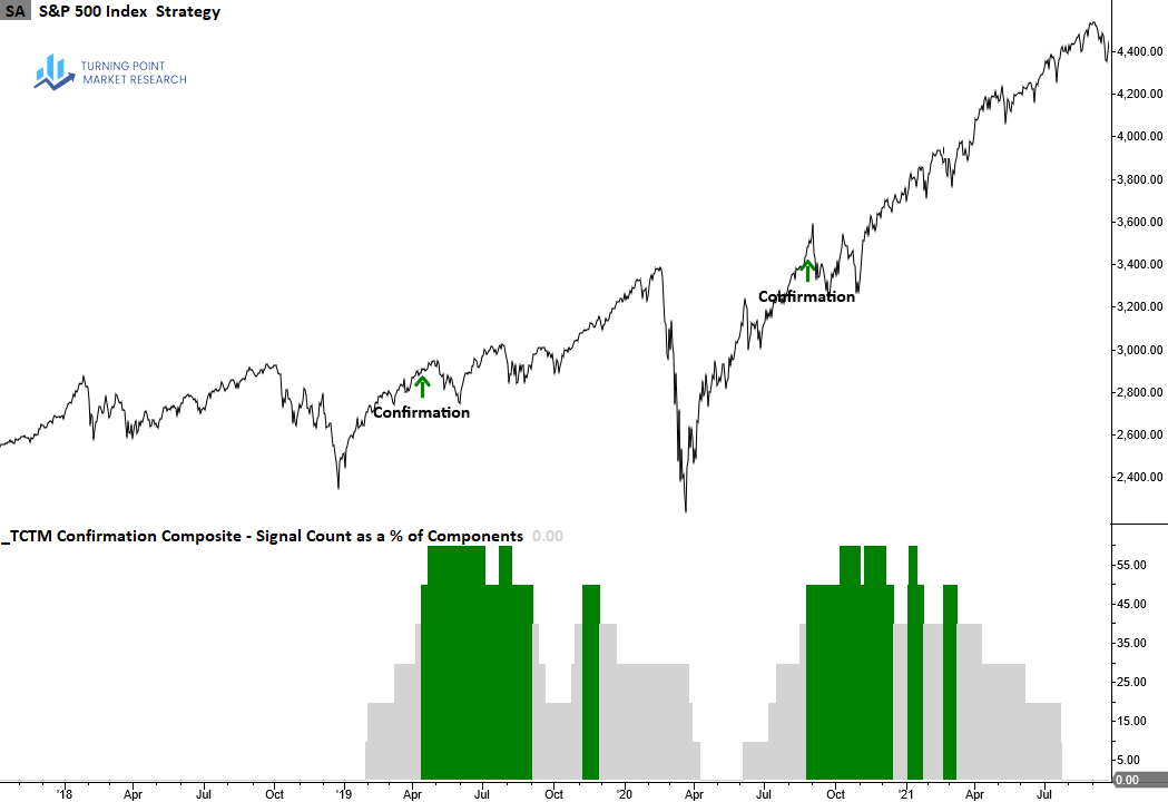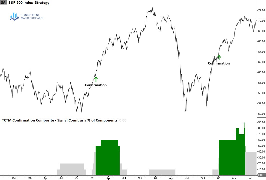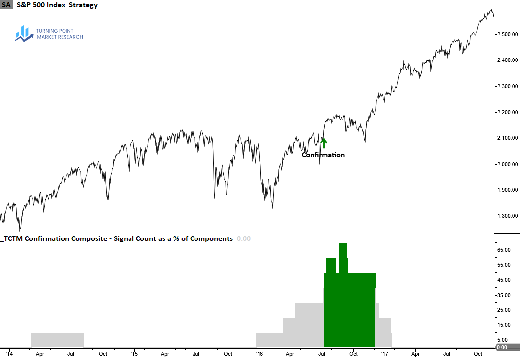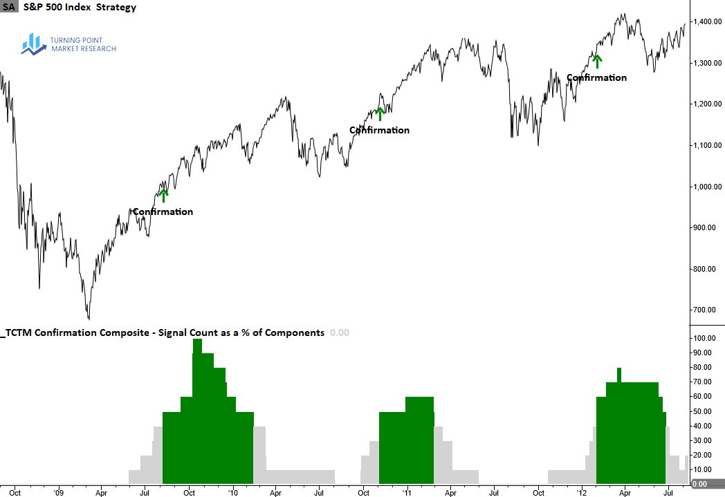 Although the number of confirmation components emerging from corrections—particularly shallow pullbacks around 10%—is not as robust as those that emerge from bear markets, the composite has done a good job of highlighting transitions out of corrections through a concentration of alerts.