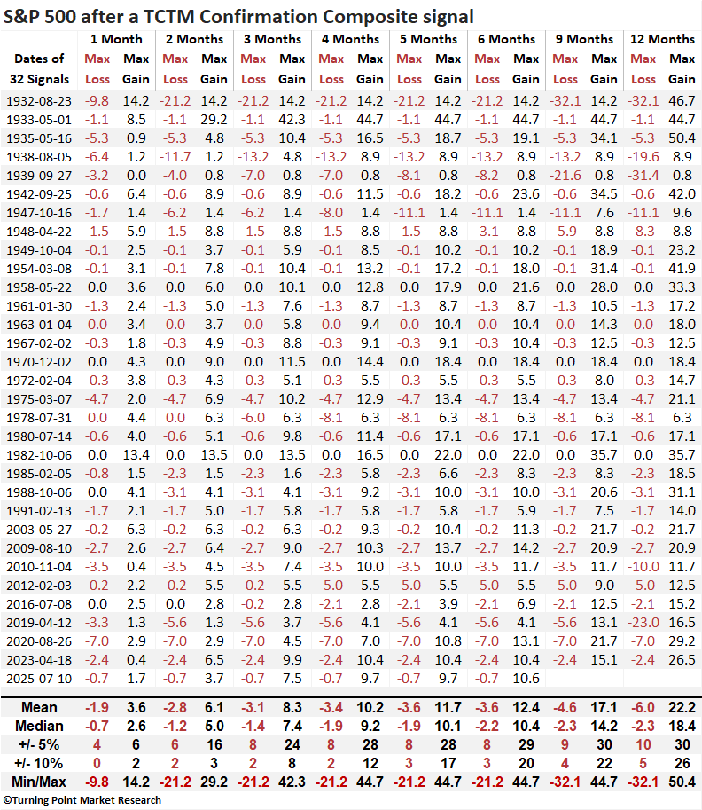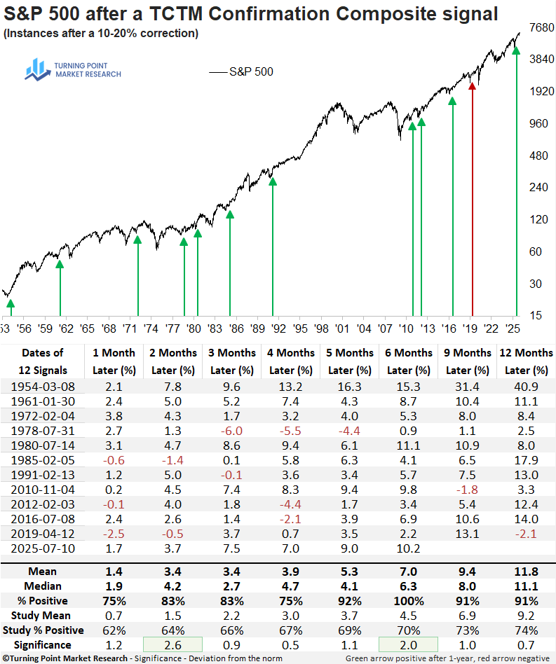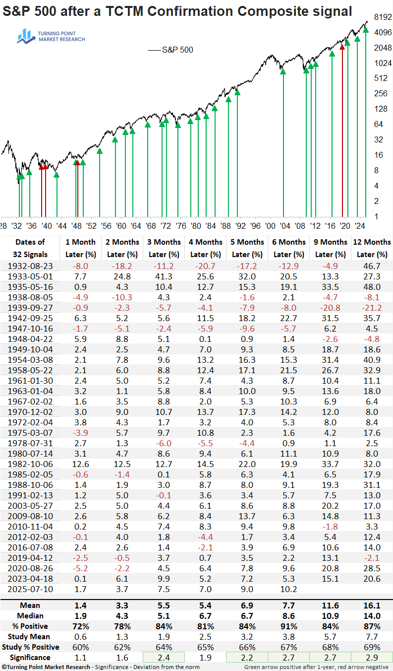 Following TCTM confirmation signals, the S&P 500 has demonstrated a strong tendency to rally over the subsequent year. The six-month horizon exhibits the highest win rate and is currently on a 25-signal winning streak, with the most recent loss occurring in 1947. Additionally, five of eight measured intervals show statistical significance relative to the full study period.