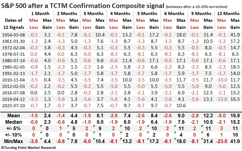 TCTM confirmation signals that occurred within the context of corrections exhibited outstanding returns and win rates, with the six-month interval showing gains in every case.