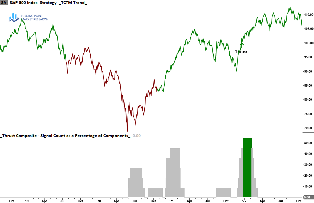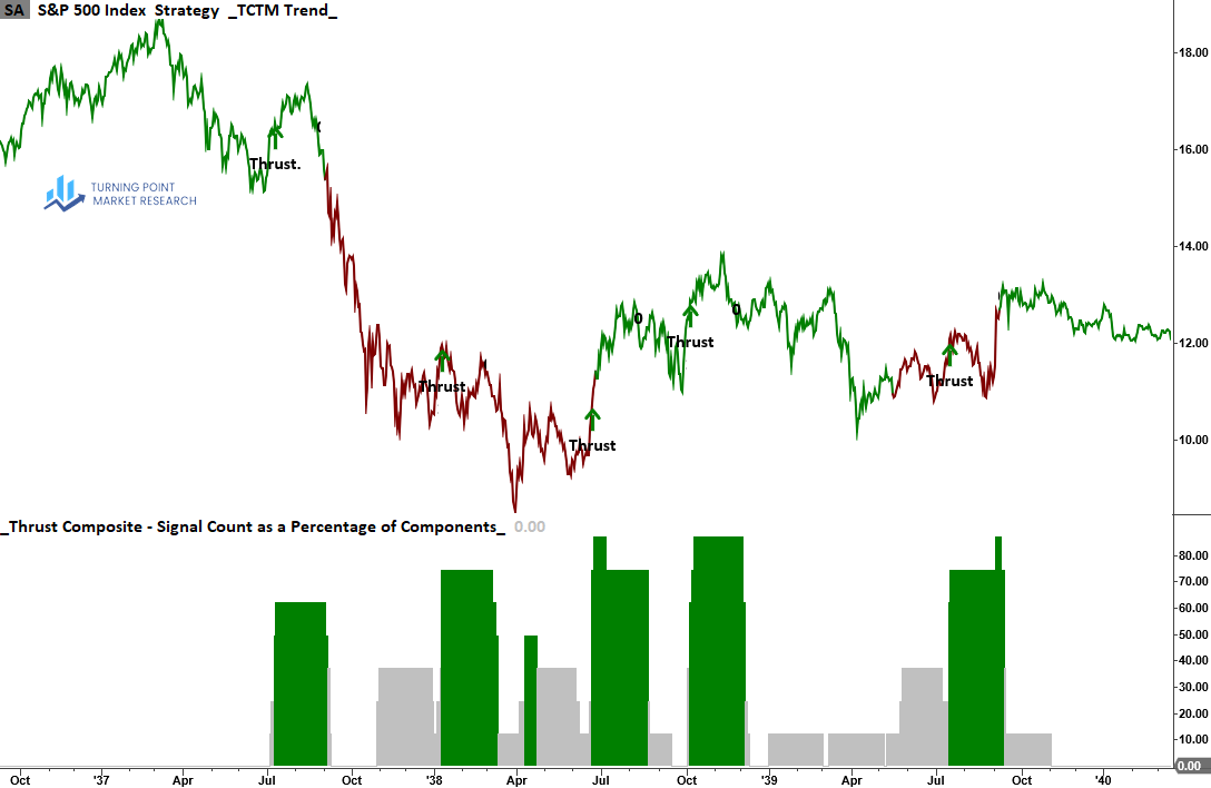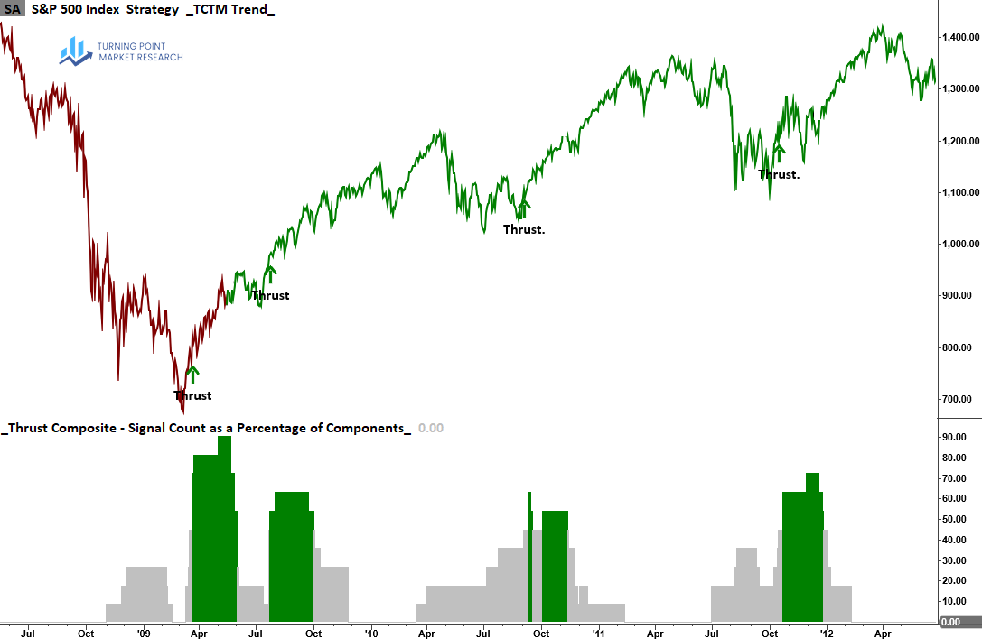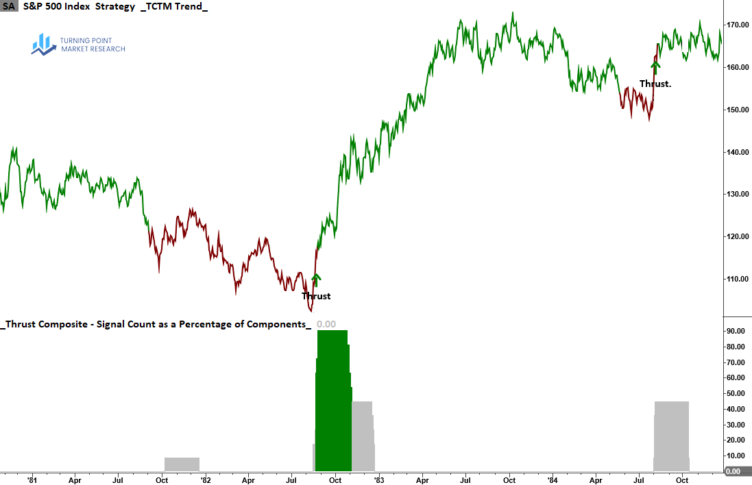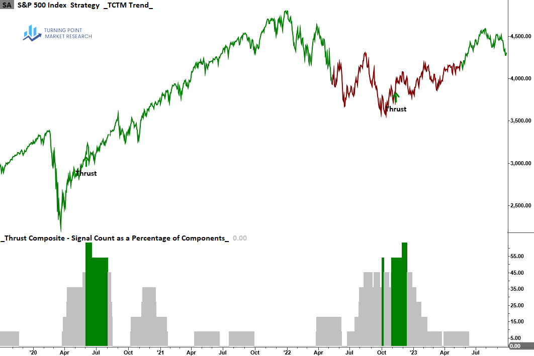 The Thrust Composite captures robust upside participation, also known as a breadth thrust. These signals often mark the end of drawdown phases and the start of significant advances.