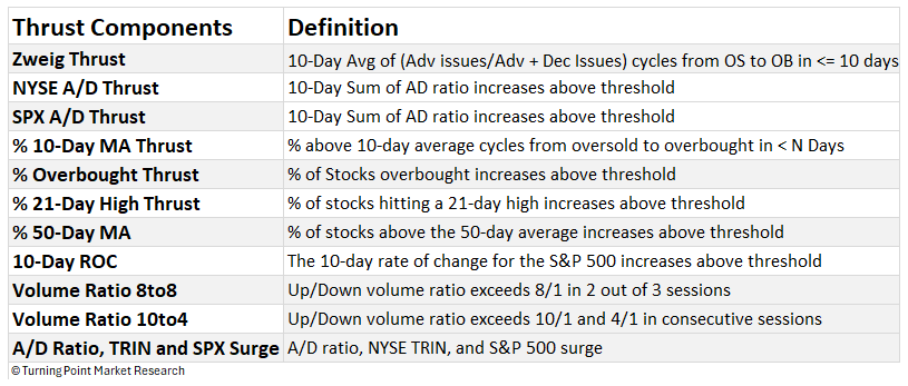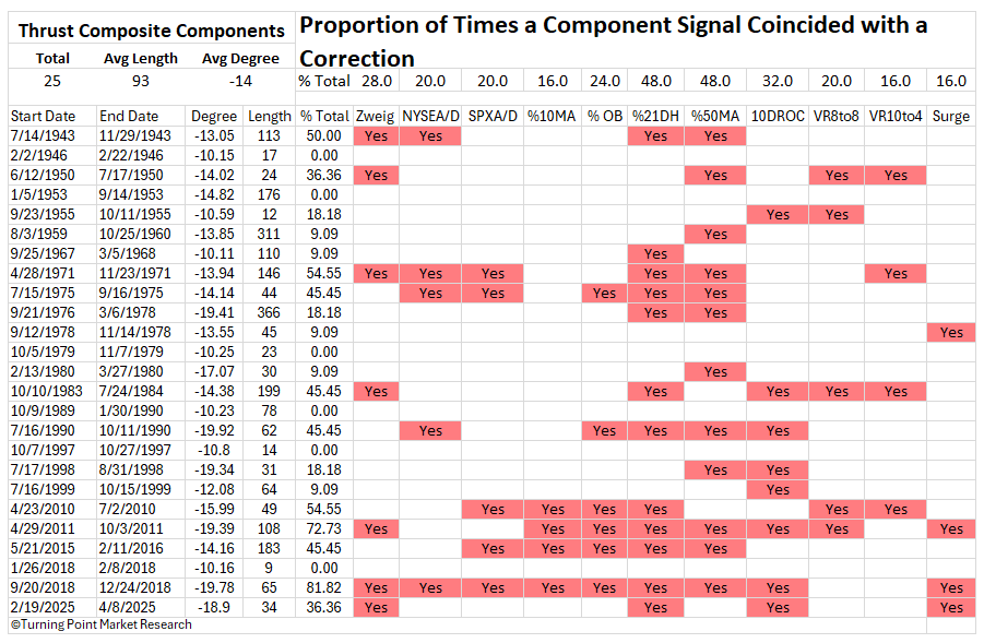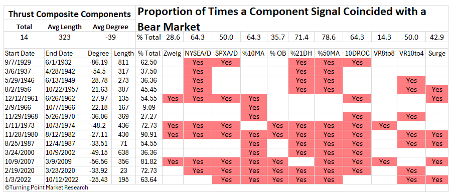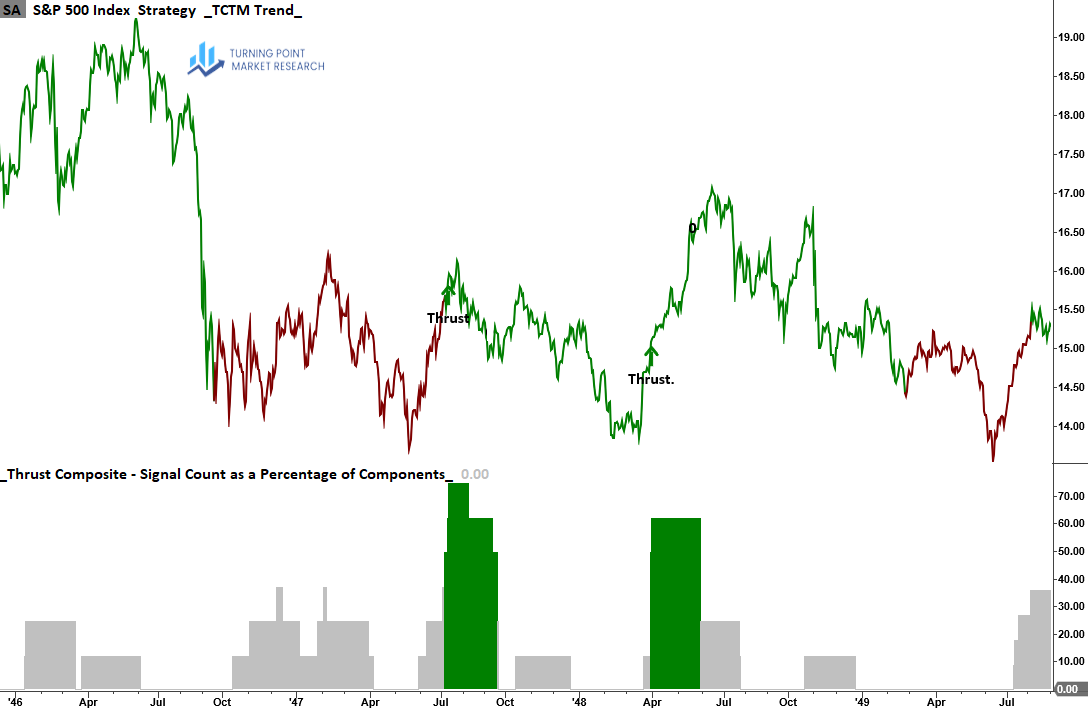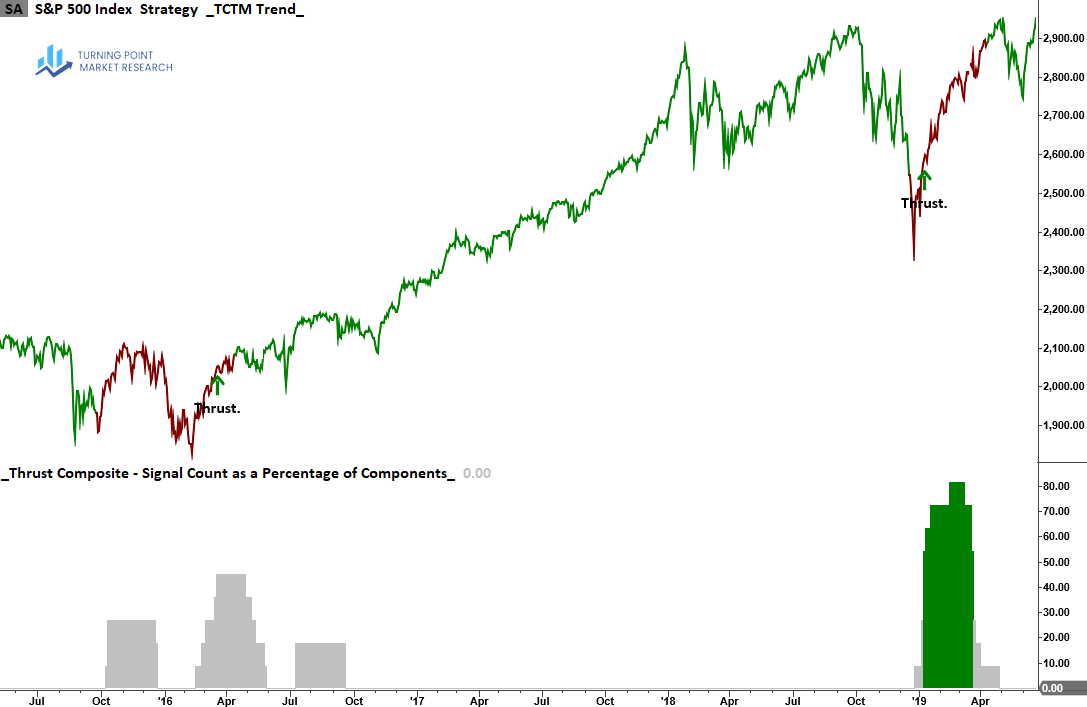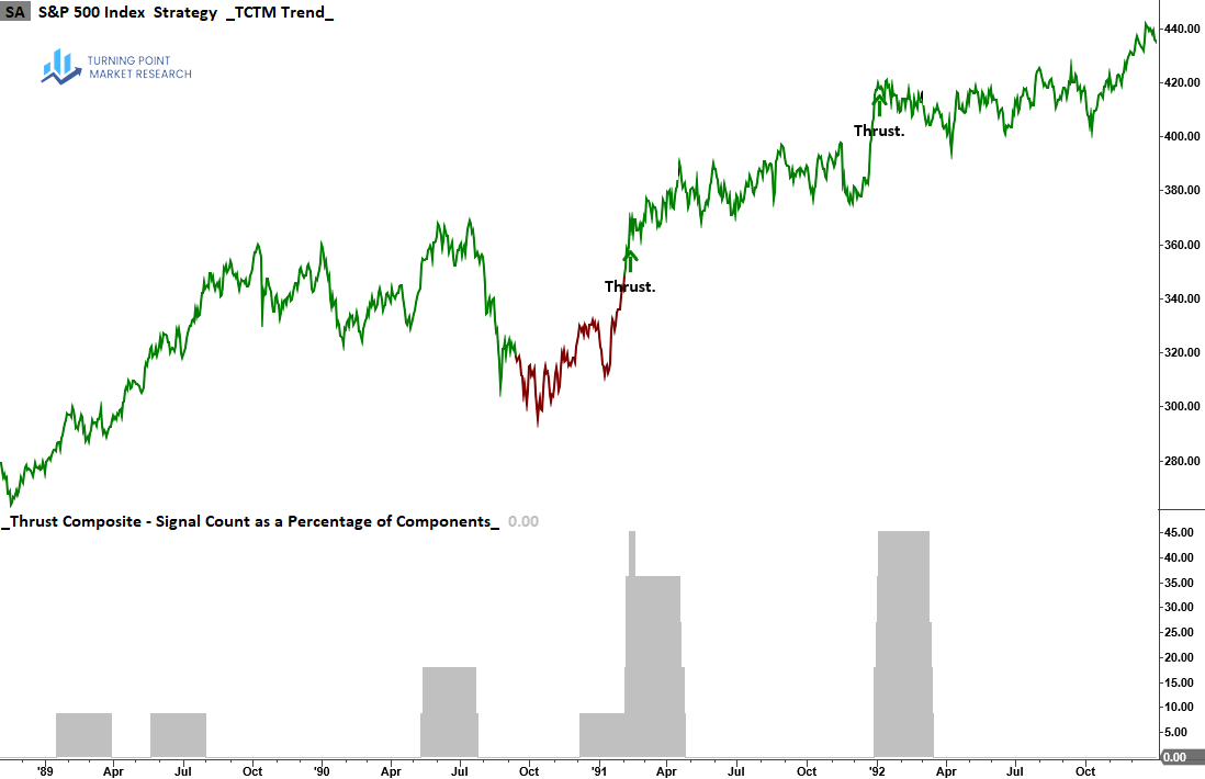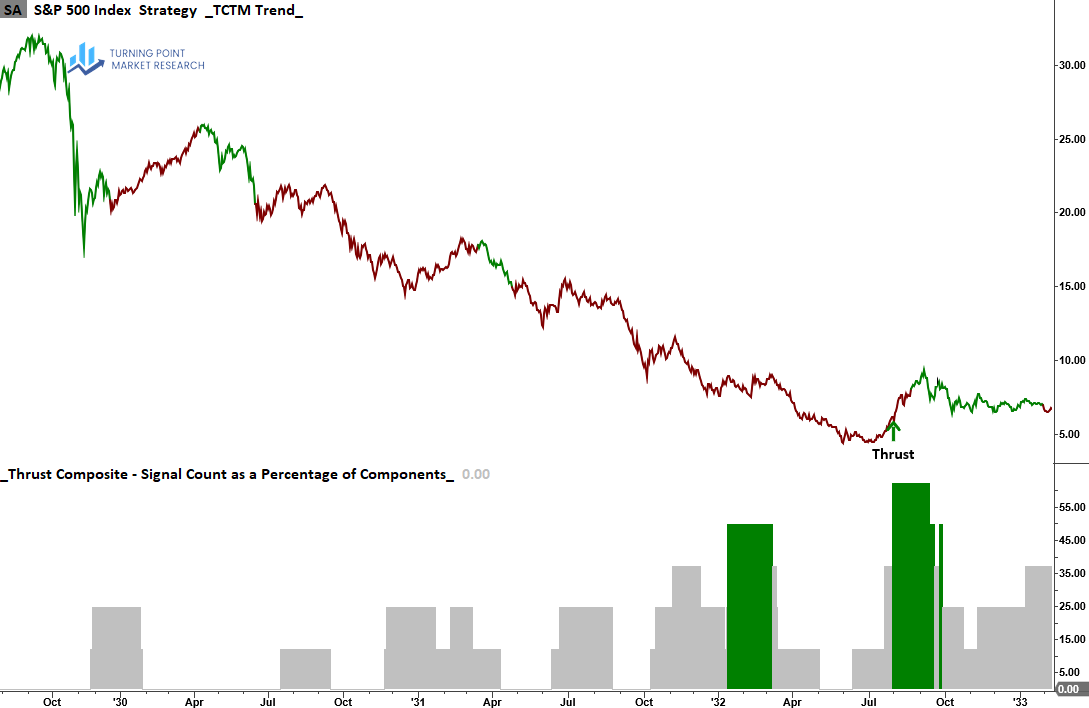 The Thrust Composite captures robust upside participation, also known as a breadth thrust. These signals often mark the end of drawdown phases and the start of significant advances.