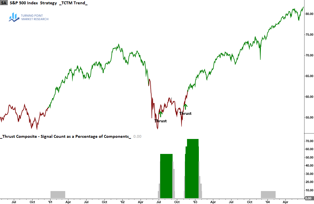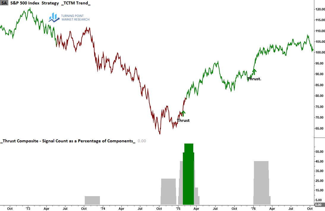 Signals from the TCTM Thrust Composite have historically marked meaningful transitions in the S&P 500 from bearish to bullish regimes. The composite failed to trigger in a limited number of instances—most notably in 1966, 1970, and 2002—standing as exceptions to an otherwise solid record of identifying bear market conclusions.