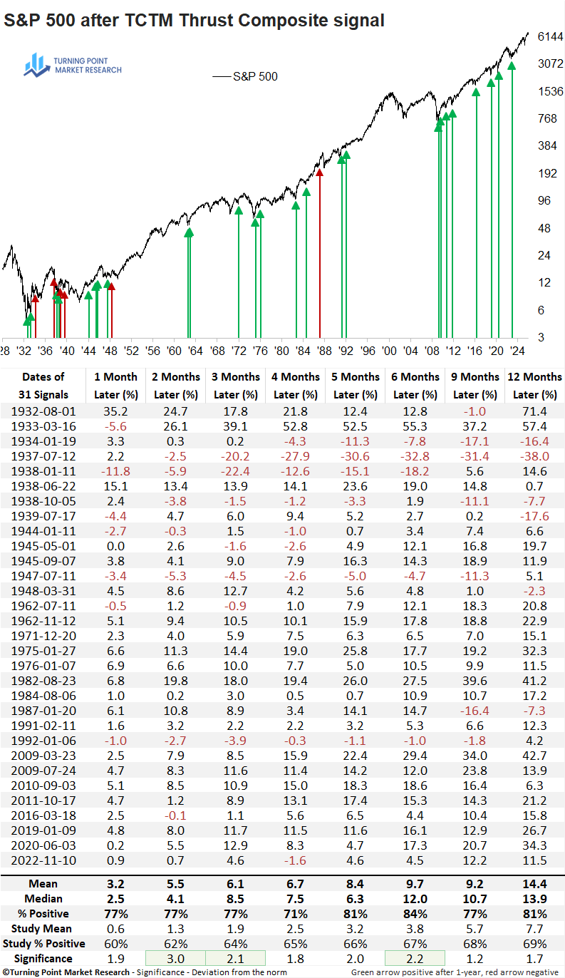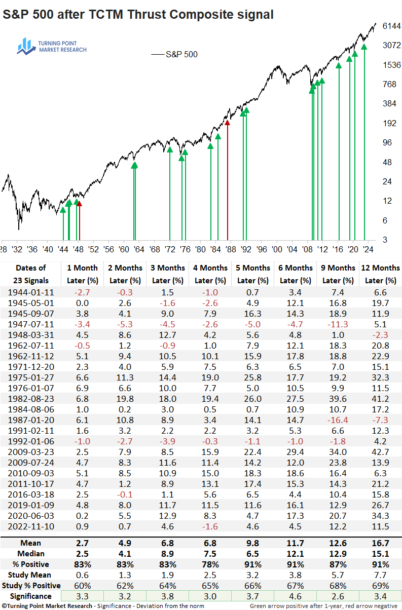 TCTM Thrust signals have identified inflection points associated with sustained equity strength. Subsequent S&P 500 returns have been both strong and reliable, demonstrating meaningful statistical significance relative to random outcomes over several time frames.