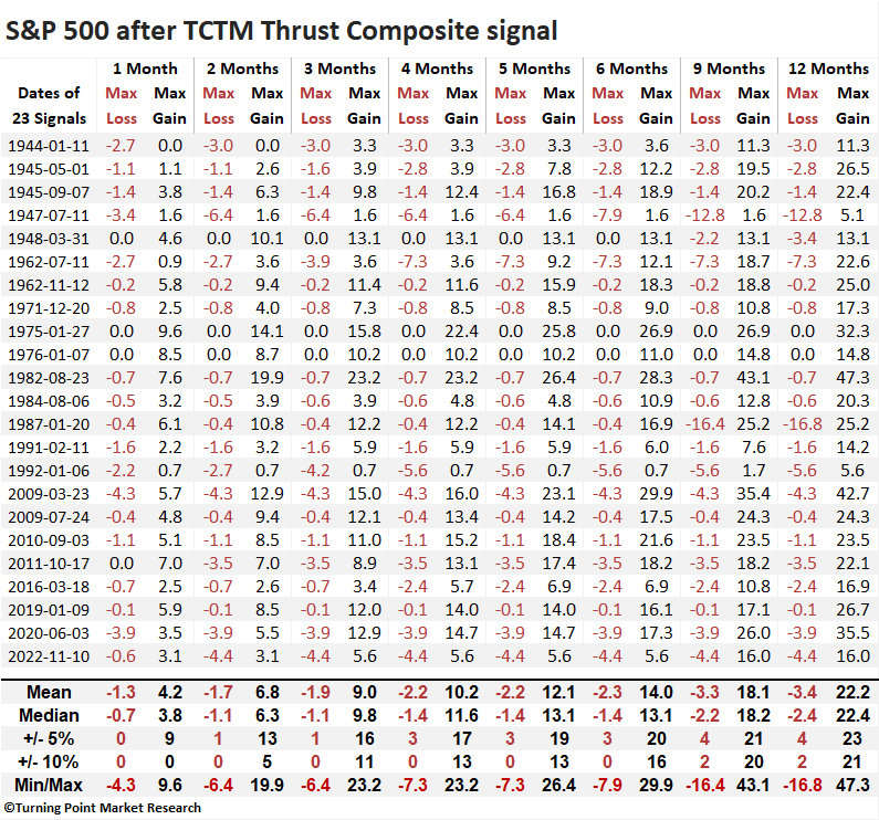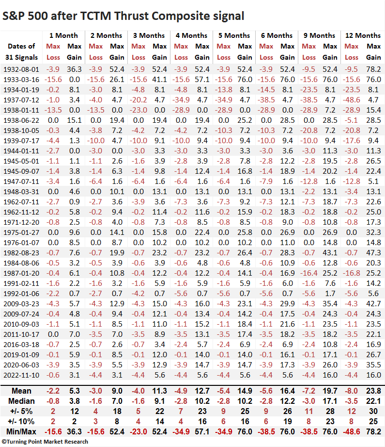 If we exclude the 1929-42 secular bear market, a period when thrust signals struggled, we see far more robust outcomes, with every time frame showing significance relative to the study period expectations.
